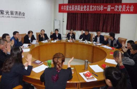 中共紫光辰济药业公司党总支2015年一届一次党员大会隆重召开 为凝聚人心、汇集发展正能量,2015年10月24日上午9时,中共紫光辰济药业公司党总支在食堂二楼会议室隆重召开2015年一届一次党员大会。党总支书记肖红星、副书记王静、工会主席李继虎、在职党员参加了会议。 会议由党总支副书记王静主持。会议应到在职党员19人,实到17人。