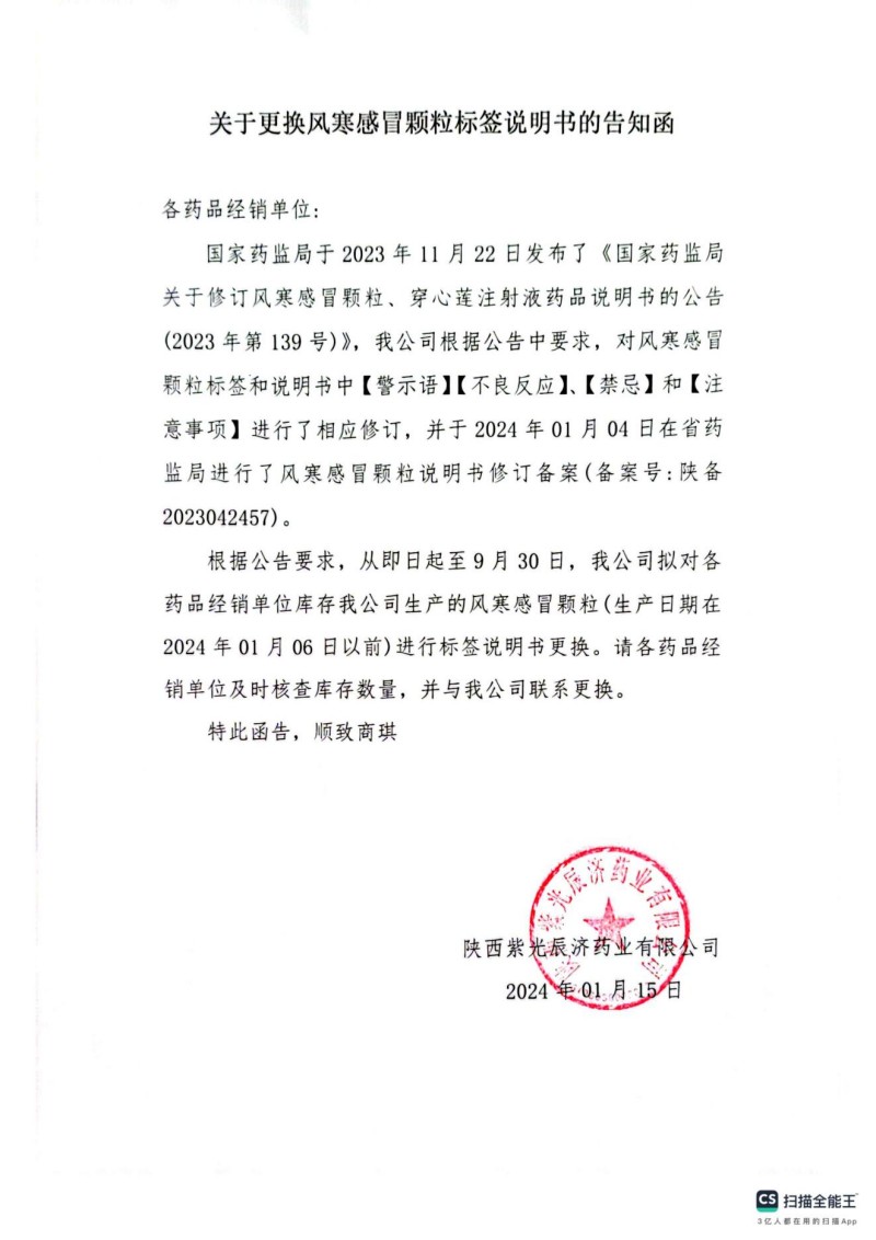 各药品经销单位: 国家药监局于2023年11月22日发布了《国家药监局关于修订风寒感冒颗粒、穿心莲注射液药品说明书的公告(2023年第139号)》,我公司根据公告中要求,对风寒感冒颗粒标签和说明书中【警示语】【不良反应】、【禁忌】和【注意事项】进行了相应修订,并于2024年01月04日在陕西省药品监督管理局进行了风寒感冒颗粒说明书修订备案(备案号:陕备2023042457)。 根据公告要求,我公司2024年1月15日已向各药品经营单位发出《关于更换风寒感冒颗粒标签说明书的告知函》,期间收到部分经营单位要求更换修订后说明书的回复函,我公司均给予更换。目前市场上仍有我公司未进行更换旧版说明书的风寒感冒颗粒,请各药品经销单位或者消费者一经发现,及时与我公司联系更换。 联系电话:0917-2909990 联系人:王女士 给您带来不便非常抱歉,特此公开函告。